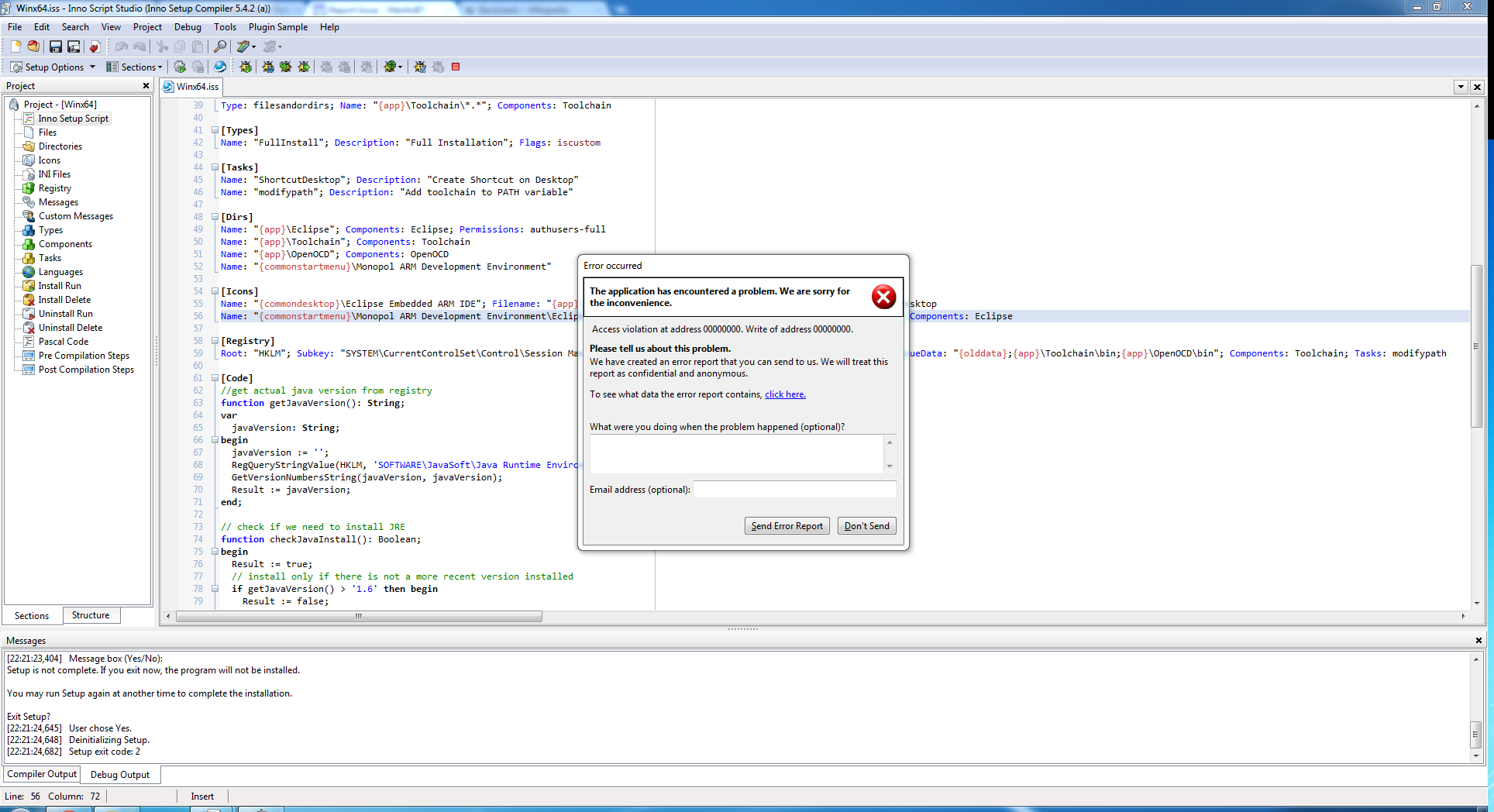 The bug report file was received, thanks for that. A beta release of 2.0.0.0 has been released, this is using the Scintilla editor instead of the previous one. The installer for this can be downloaded from: http://www.kymoto.org/downloads/ISStudio_Beta_Latest.exe Could you please try this version and feedback if the issue still exists. |