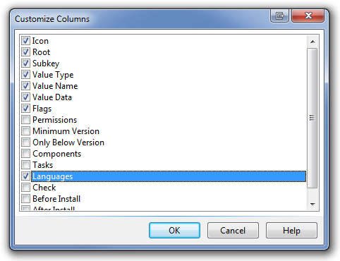 To add the Languages column to the Registry section view, complete the following: 1. Right click in the Registry section view, and click on the Customize View item (See registry_section1.png above) 2. Find Languages in the dialog and place a tick next to it (See customize_columns.png above) 3. Click on "OK" to close the dialog and update the view |