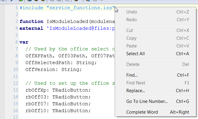 | Description | Currently the menu item for "Open #Include File" is not available when in the Pascal Code view. Adding this would allow easier access to opening include files that are with in the code section of the Inno Setup script. | ||||